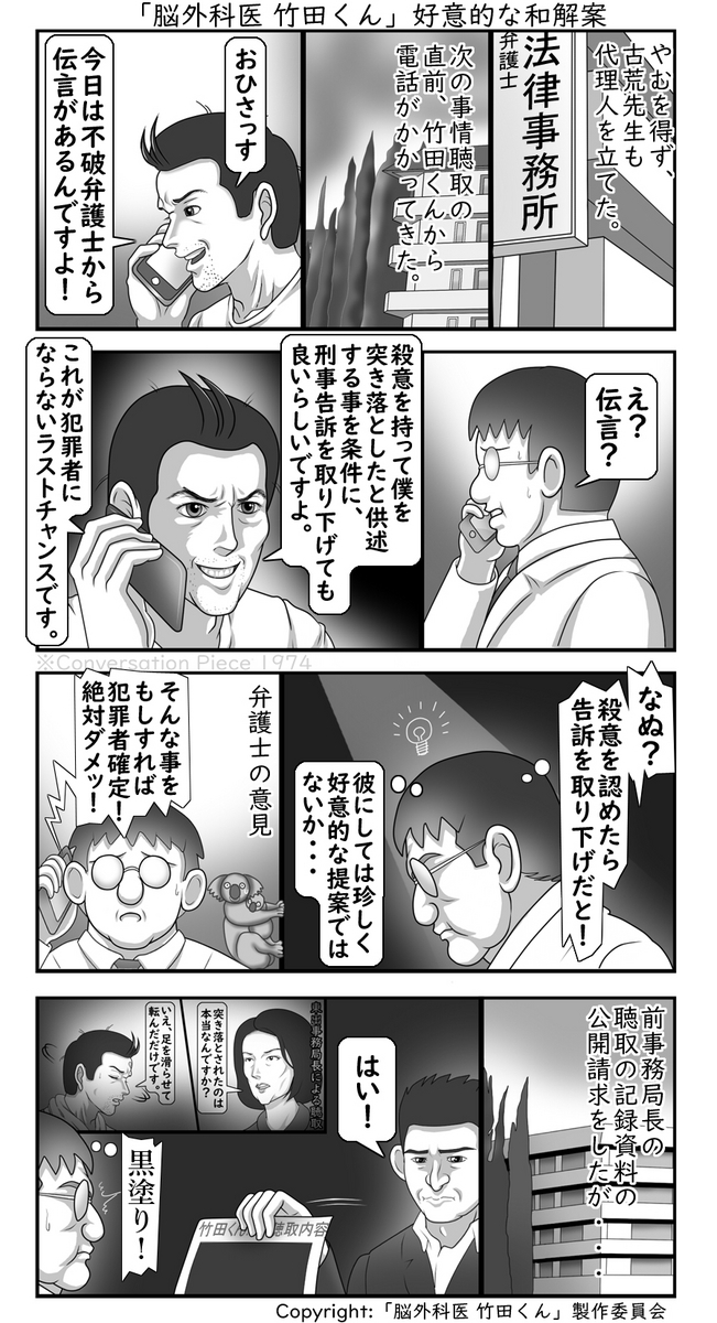 「なぬ?殺意を認めたら告訴取り下げだと!」古荒先生は思った。「彼にしては珍しく好意的な提案ではないか。」